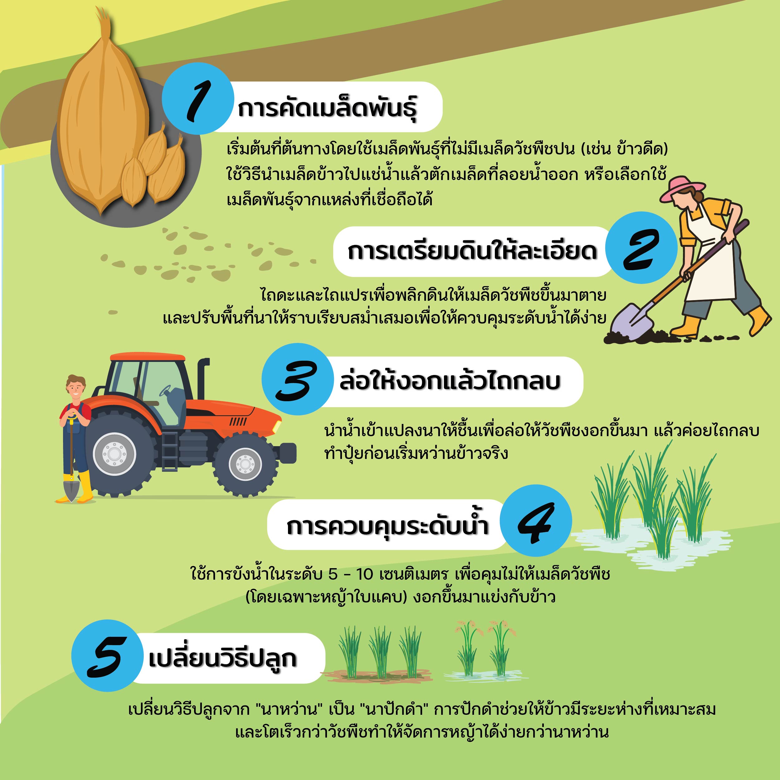 ล่อหญ้าให้ออกมาตายด้วยการไถกลบ และคุมน้ำให้หญ้าไม่ขึ้นทำแล้วรับรองเปลี่ยนนาหญ้าให้เป็นนารวงทองแบบมือโปรและประหยัดงบแน่นอน