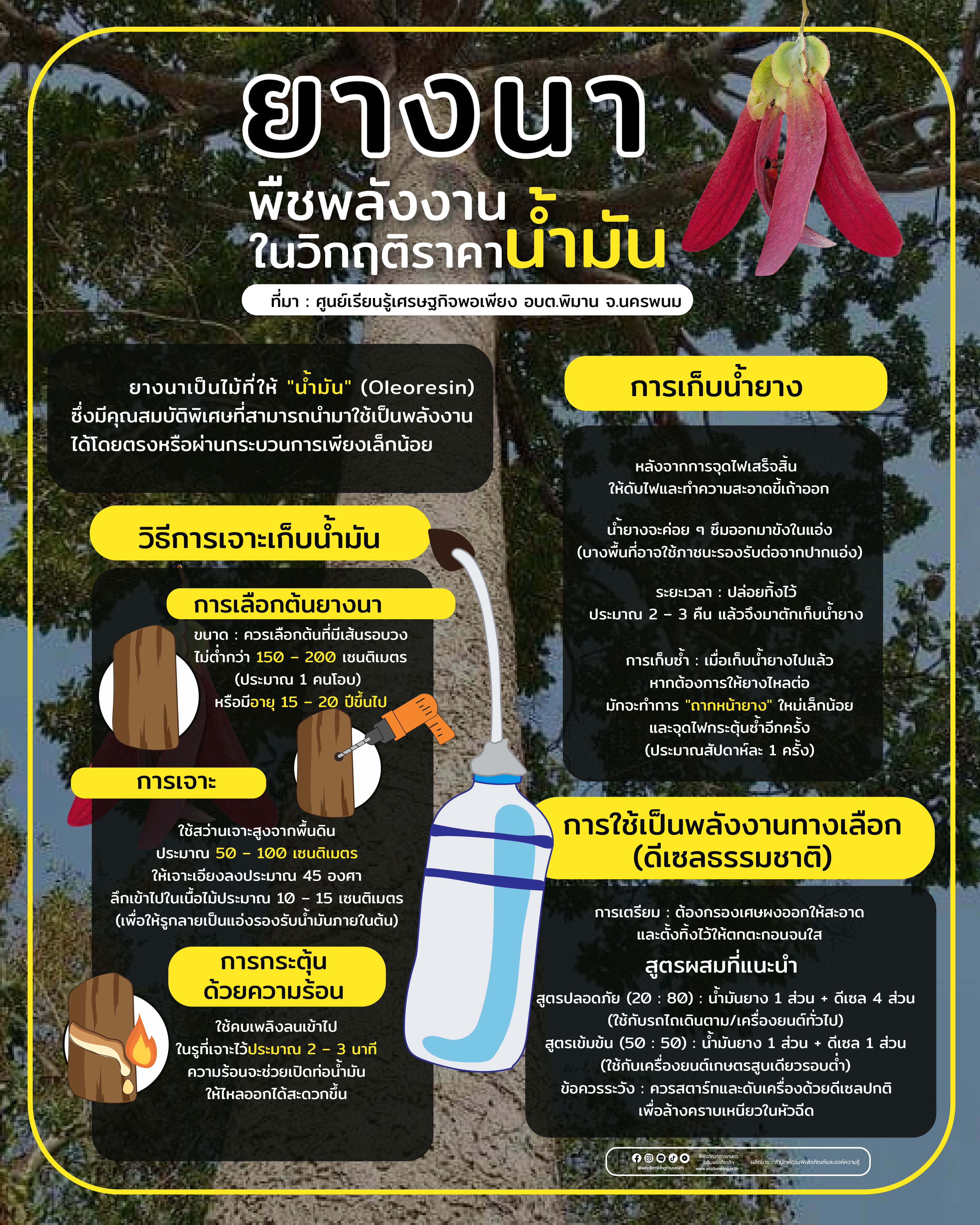 แต่ยังซ่อนขุมพลังงานที่เรียกว่า น้ำมันยาง (Oleoresin) ซึ่งสามารถนำมาปรับใช้เป็นเชื้อเพลิงทดแทนสำหรับเครื่องยนต์เกษตรได้จริง